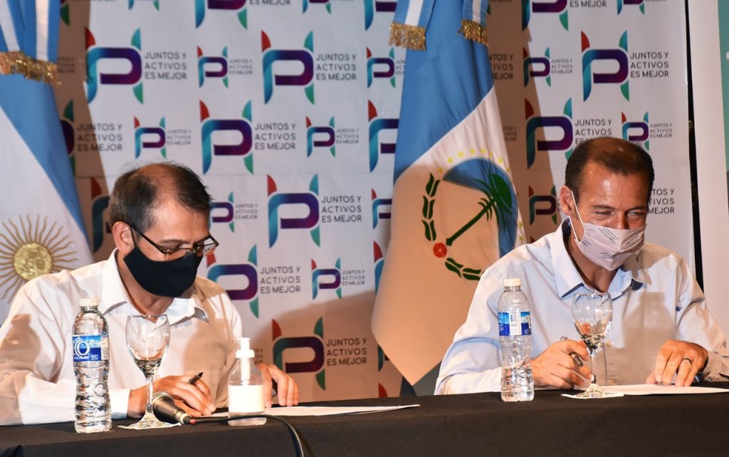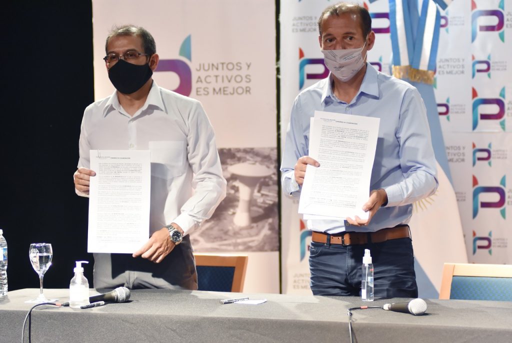 El gobernador Omar Gutiérrez y el intendente Gustavo Suárez firmaron esta tarde un convenio de colaboración entre la provincia y el municipio de Plaza Huincul, para el desarrollo conjunto del parque industrial en la localidad. Gutiérrez pasó por la localidad después de las actividades que cumplió en Zapala.