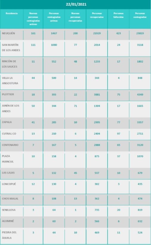 Además, se reportaron quinientas noventa (590) nuevas personas recuperadas de Coronavirus (COVID-19) de la provincia del Neuquén: 200 personas de Neuquén capital, 77 personas de San Martín de los Andes, 71 personas de Junín de los Andes, 48 personas de Rincón de los Sauces, 45 personas de Las Lajas, 22 personas de Plottier, 14 personas de Villa La Angostura, 13 personas de Chos Malal, 11 personas de San Patricio del Chañar, 10 personas de Piedra del Águila, 10 personas de Zapala, 9 personas de Tricao Malal, 8 personas de Las Ovejas, 8 personas de Barrancas, 6 personas de Cutral Co, 5 personas de Centenario, 5 personas de Andacollo, 4 personas de Villa El Chocón, 4 personas de Plaza Huincul, 4 personas de Loncopué, 3 personas de Mariano Moreno, 3 personas de El Huecú, 3 personas de Buta Ranquil, 2 personas de Aluminé, 1 persona de Coyuco-Cochico, 1 persona de Los Catutos, 1 persona de Añelo, 1 persona de Santo Tomás y 1 persona de Senillosa. Se trata de 299 mujeres y 291 varones, cuyas edades oscilan entre 1 mes y 94 años.