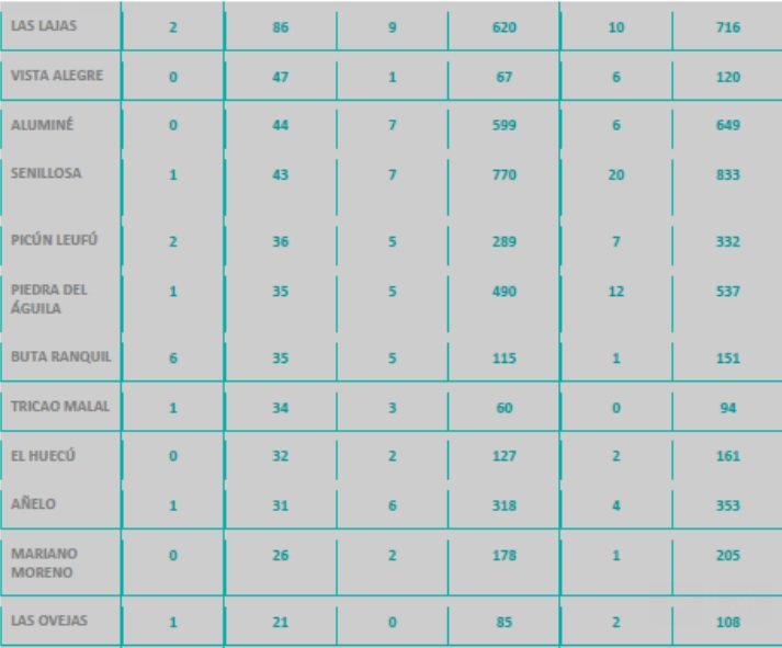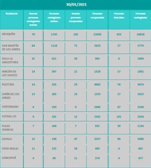 Además, se reportaron 471 nuevas personas recuperadas de Coronavirus (COVID-19) de la provincia del Neuquén: 105 personas de Neuquén, 72 personas de San Martín De Los Andes, 47 personas de Zapala, 38 personas de Villa La Angostura, 29 personas de Plottier, 28 personas de Chos Malal, 22 personas de Rincón de Los Sauces, 19 personas de Junín De Los Andes, 12 personas de Cutral Co, 11 personas de Loncopué, 9 personas de Las Lajas, 9 personas de Centenario, 8 personas de Villa Pehuenia, 7 personas de Plaza Huincul, 7 personas de Senillosa, 7 personas de Aluminé, 6 personas de Añelo, 5 personas de Piedra del Águila, 5 personas de Picún Leufú, 5 personas de Buta Ranquil, 4 personas de Caviahue-Copahue, 3 personas de Barrancas, 3 personas de Tricao Malal, 2 personas de Mariano Moreno, 2 personas de El Cholar, 2 personas de El Huecú, 2 personas de San Patricio del Chañar, 1 persona de Villa El Chocón y 1 persona de Vista Alegre. Se trata de 248 mujeres y 223 varones, cuyas edades oscilan entre 4 meses y 100 años.