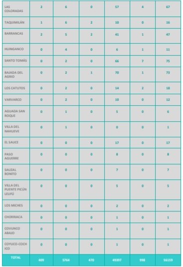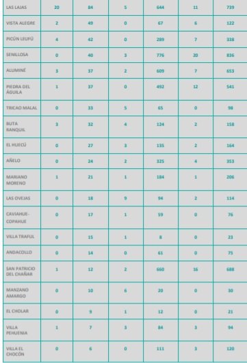 Por otra parte, se informó el fallecimiento de siete (7) personas de la provincia del Neuquén por Coronavirus (COVID-19): 2 personas de Neuquén capital, 1 personas de Zapala, 1 persona de San Martín de los Andes, 1 persona de Junín de los Andes, 1 personas de Las Lajas y 1 persona de Buta Ranquil. Se trata de 1 mujer y 6 varones, cuyas edades oscilan entre 35 y 82 años.
