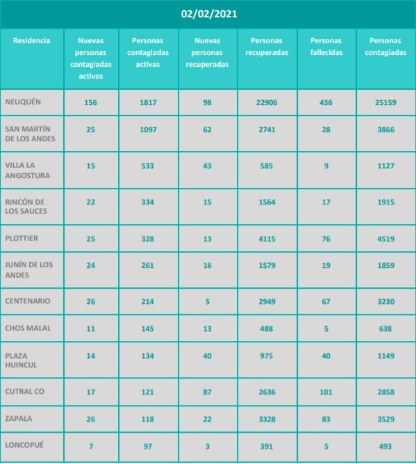 Además, se reportaron cuatrocientas setenta (470) nuevas personas recuperadas de Coronavirus (COVID-19) de la provincia del Neuquén: 98 personas de Neuquén, 87 personas de Cutral Co, 62 personas de San Martín de los Andes, 43 personas de Villa La Angostura, 40 personas de Plaza Huincul, 22 personas de Zapala, 16 personas de Junín de los Andes, 15 personas de Rincón de los Sauces, 13 personas de Plottier, 13 personas de Chos Malal, 9 personas de Las Ovejas, 6 personas de Manzano Amargo, 5 personas de Las Lajas, 5 personas de Tricao Malal, 5 personas de Centenario, 4 personas de Buta Ranquil, 3 personas de El Huecú, 3 personas de Villa Pehuenia, 3 personas de Senillosa, 3 personas de Loncopué, 2 personas de Barrancas, 2 personas de Añelo, 2 personas de San Patricio Del Chañar, 2 personas de Taquimilán, 2 personas de Aluminé, 1 persona de Mariano Moreno, 1 persona de Villa Traful, 1 persona de Caviahue-Copahue, 1 persona de El Cholar y 1 persona de Bajada del Agrio. Se trata de 246 mujeres y 224 varones, cuyas edades oscilan entre 1 y 84 años.