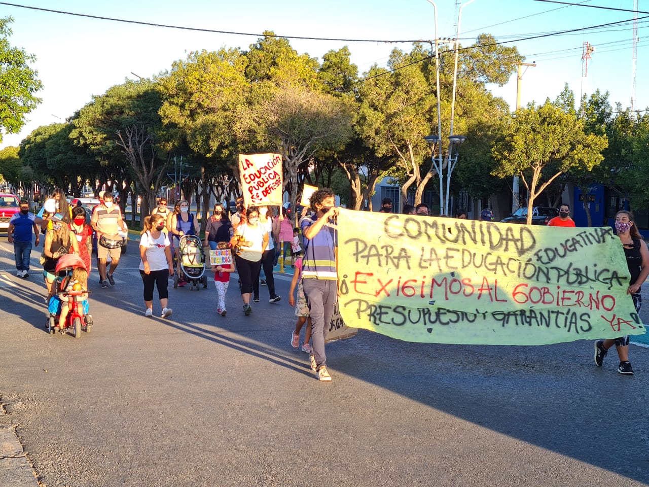 El motivo de la marcha era el reclamo a las autoridades provinciales, encabezadas por el gobernador Omar Gutiérrez para que se garanticen las condiciones de los edificios escolares, en la comarca petrolera ante el anuncio del comienzo del ciclo lectivo 2021 del 3 de marzo próximo.