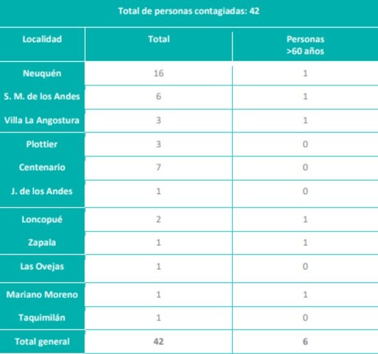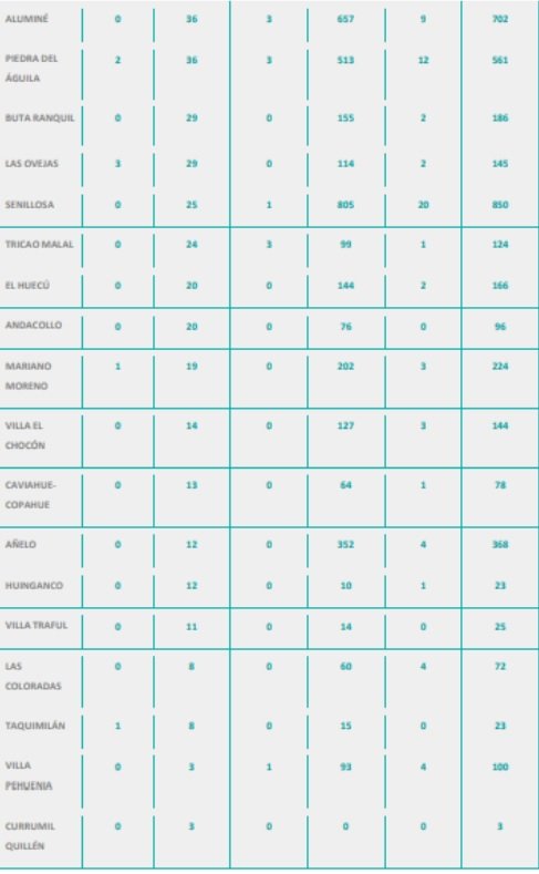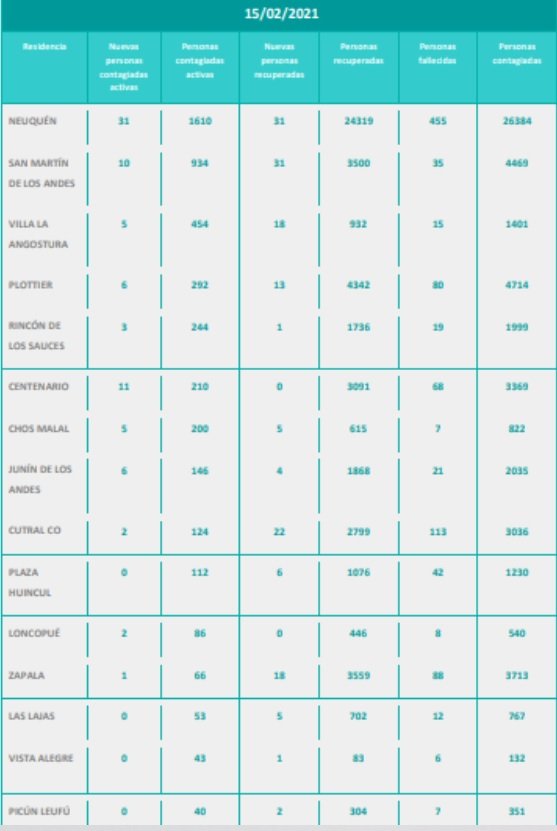Se confirmó el fallecimiento de siete personas de la provincia del Neuquén por Coronavirus (COVID-19): 3 personas de Cutral Co, 1 persona de Rincón de los Sauces, 1 persona de Neuquén capital, 1 persona de Mariano Moreno y 1 persona de Villa La Angostura. Se trata de 2 mujeres y 5 varones, cuyas edades oscilan entre 41 y 75 años.