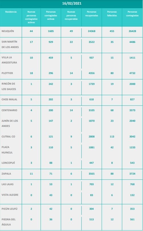 Se detalló que las personas fallecidas por covid-19 son: 2 de Junín de los Andes, 1 persona de Mariano Moreno y una persona de Aluminé. Se trata de 3 mujeres y 1 varón, cuyas edades oscilan entre 86 y 92 años.