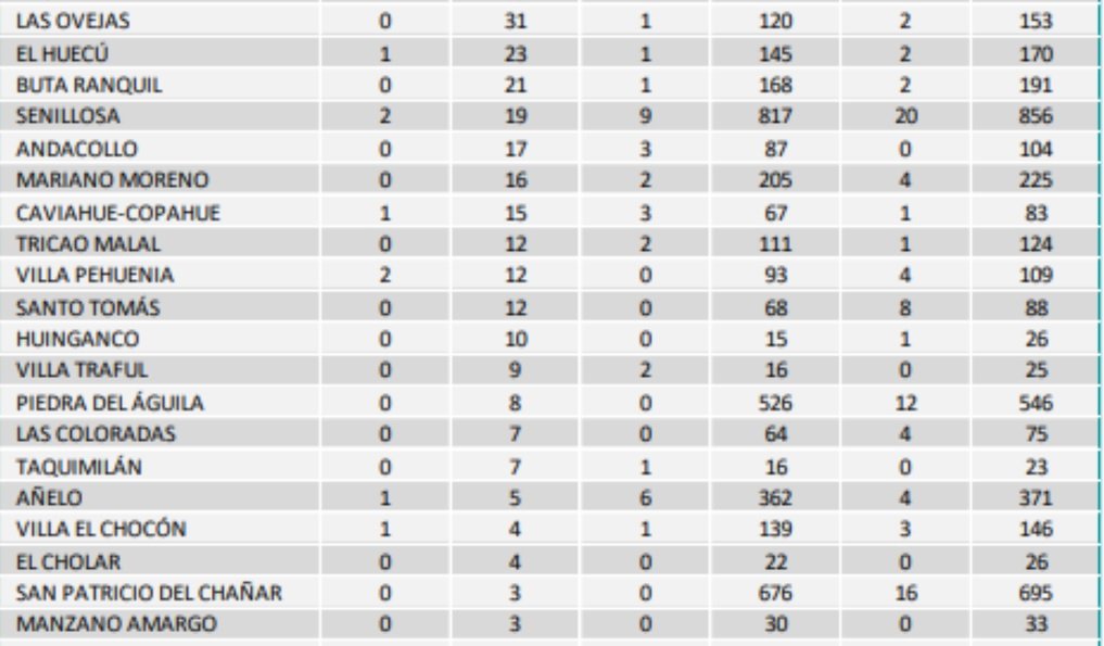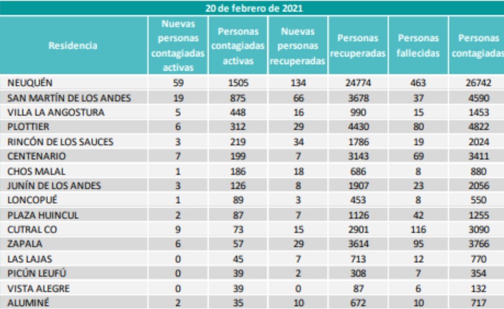Mientras que las personas recuperadas en total son 417. De ellas, 15 corresponden a vecinos de Cutral Co y 7 de Plaza Huincul, es decir que son 22 en total.