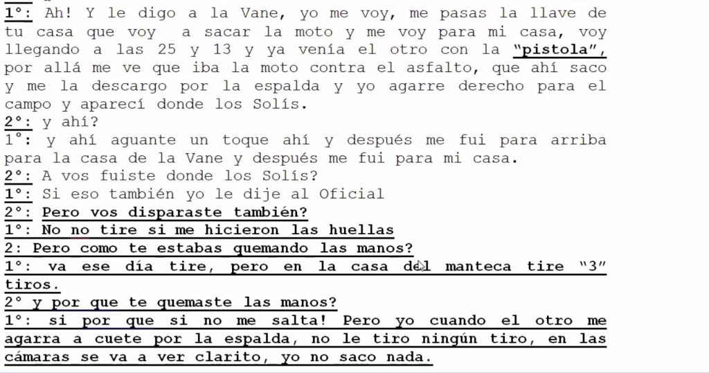 ¿”Pero vos disparaste también? le preguntaba su novia. “No, no, si no tiré si me hicieron las huellas ese día”. “Pero cómo te estabas quemando las manos? Bah, en la casa del Manteca, tiré tres tiros y me quemé la manos porque sino me salta. Pero yo cuando el otro me agarra a cuete por la espalda, no le tiro ningún tiro. En las cámaras se ve clarito, yo no saco nada”, sigue en el relato.