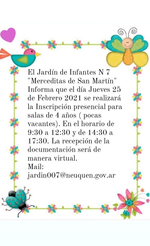 Desde el jardín de infantes Nº3 del barrio Parque Este indicaron que hoy sería la jornada de inscripción para ingresantes a la sala de 4 años. La documentación debe enviarse de forma virtual al mail jardin007@neuquen.gov.
