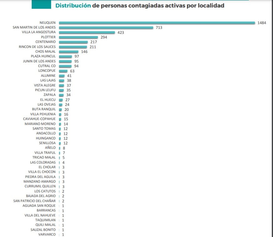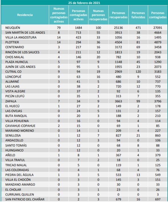 De todos estos casos, 5 corresponden a Cutral Co y 9 corresponden a Plaza Huincul. Se informó que hubo 28 casos de recuperados 9 corresponden a Cutral Co y 19 corresponden a Plaza Huincul.