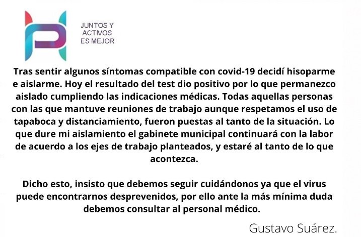 Más adelante, detalló que todas aquellas personas con las que mantuvo reuniones e trabajo “aunque respetamos el uso de tapaboca y distanciamiento” fueron puestas al tanto de la situación”. Indicó que “lo que dure mi aislamiento, el gabinete municipal continuará con la labor de acuerdo a los ejes de trabajo planteados, y estaré al tanto de lo que acontezca”.
