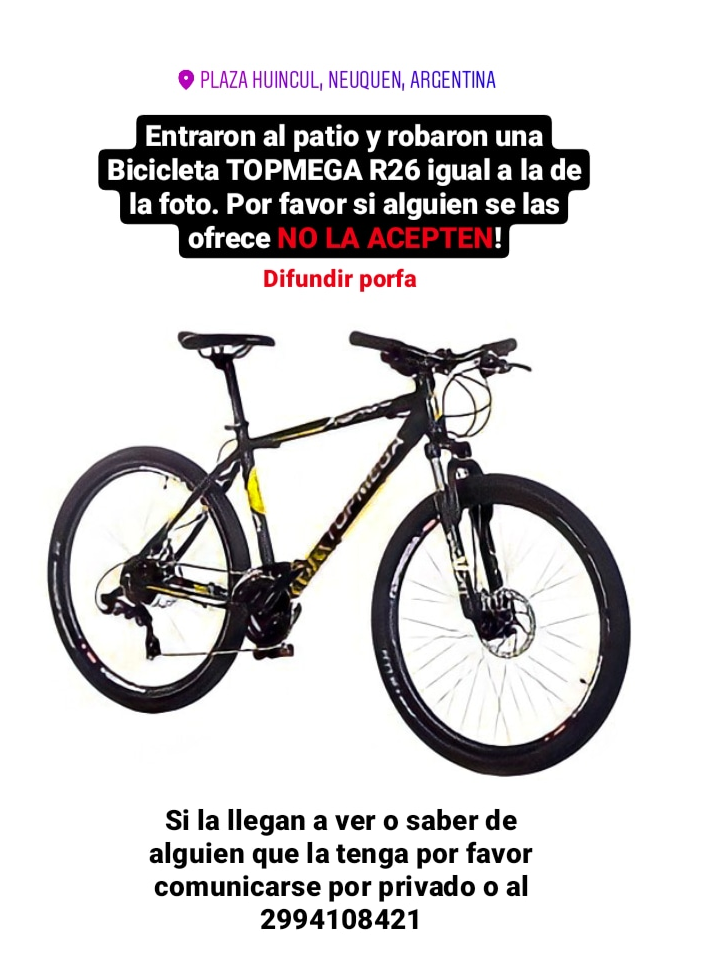 Un vecino de Plaza Huincul pide ayuda a través de sus redes sociales para recuperar la bicicleta que le robaron desde el patio de su domicilio.