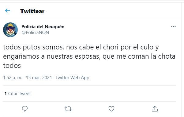 El escandaloso tweet fue publicado minutos antes de las 2 de la mañana de hoy, en la cuenta oficial de la Policía del Neuquén. Hasta el momento, no hubo explicaciones al respecto.
