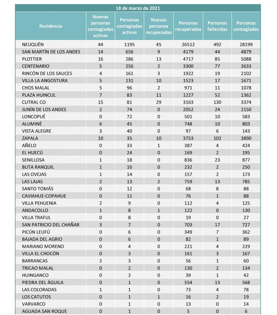 Además se informó de un nuevo fallecimiento, de una persona de Cutral Co y ya suman 182 muertos desde que se inició la pandemia.