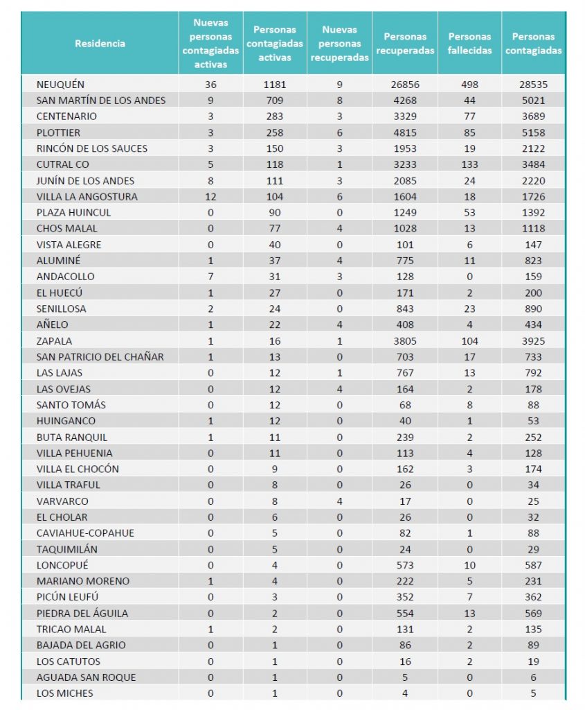Se trata de cinco casos de Cutral Co y ninguno de Plaza Huincul, entre los nuevos contagios. El recuperado es 1 cutralquense y ningún huinculense. En cuanto a los casos activos, suman 208 (118 y 90 respectivamente).