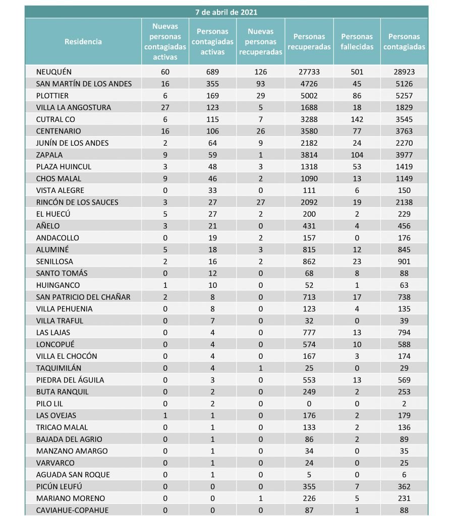 El parte único del comité de emergencia provincial confirmó además 10 recuperados, siete cutralquenses y tres huinculenses. Los casos activos de Cutral Co son 115 y los de Huincul 48, en total 163.
