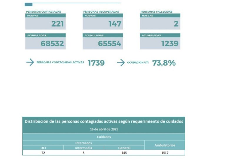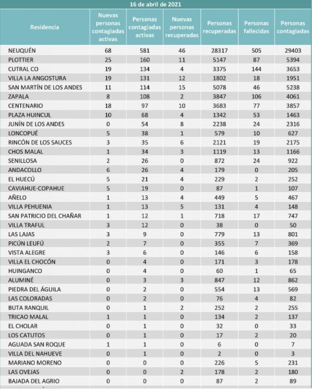 En cuanto a los recuperados, hay cuatro pacientes cutralquenses y 4 huinculenses, que totalizan ocho. Los casos activos son 134 en la primera localidad y 68 en la segunda, es decir 202.