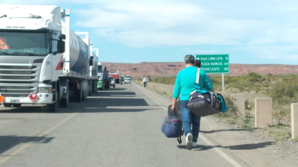 Donde termina Añelo comienza el contrapiquete, desde allí solamente hay camiones y camiones apostados sobre las dos vías de la ruta 7. Y ya no se puede avanzar hasta San Patricio de El Chañar. Intentaron bloquear la asistencia hacia el piquete sobre ruta 17 pero sin resultados.