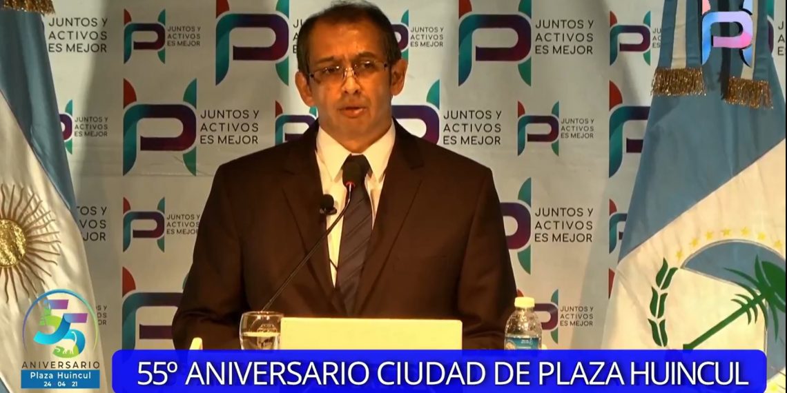 El intendente Gustavo Suárez hizo el discurso en el aniversario 55º de la institucionalización de Plaza Huincul. Lo hizo en el Centro Cultural “Gregorio Álvarez” y solo ante las secretarias y secretarios del Ejecutivo; las y los concejales, porque cuestiones de protocolo Covid-19 no hubo más asistentes.