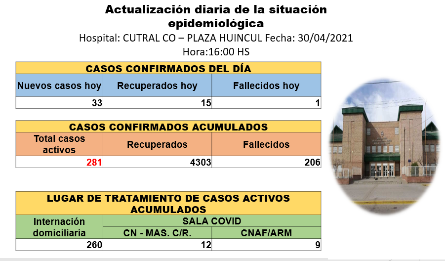 Según la información suministrada por el servicio de Epidemiología del hospital de Complejidad Media, en el informe de las 16, en Cutral Co y Plaza Huincul falleció una persona, por lo que el total de muertes asciende a 206. Por otra parte se registraron 33 casos nuevos mientras que se informó que hay 15 personas recuperadas de la enfermedad.