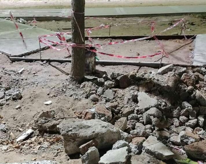 Un árbol del bulevar de Castagnous quedó atrapado en un bloque de cemento de las nuevas veredas en construcción. Se convirtió en meme y mandaron a corregirlo. Por suerte, el árbol se salvó.