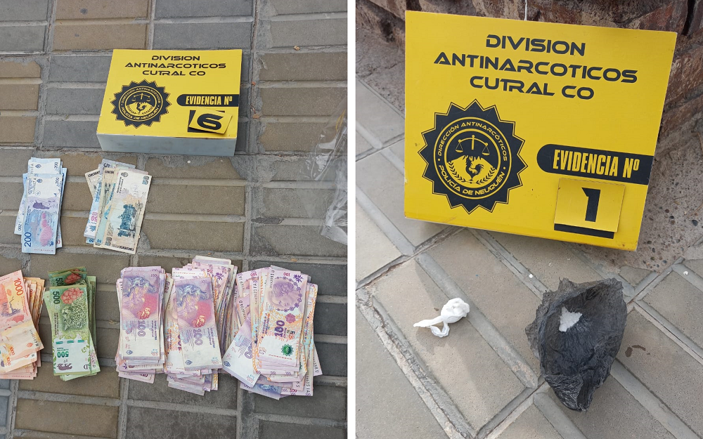 Ante esta situación se da aviso a la División Antinarcóticos Cutral Co, quienes luego constatan que el hombre llevaba varias dosis de marihuana y otras de cocaína, lista para comercializar. En tanto que la femenino tenía más de 150.000 pesos en efectivo y una balanza digital .