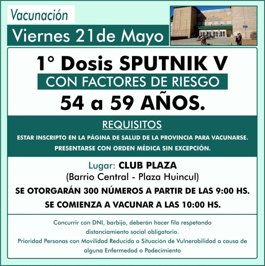 Por otro lado, en el Club Plaza, habrá 300 turnos y comenzarán a inscribir a las 9, mientras que la aplicación de la primera dosis de vacunas Sputnik V será a partir de las 10 para personas de entre 54 y 59 años con factores de riesgo. En este caso solo vacunarán a personas inscriptas en el registro provincial.