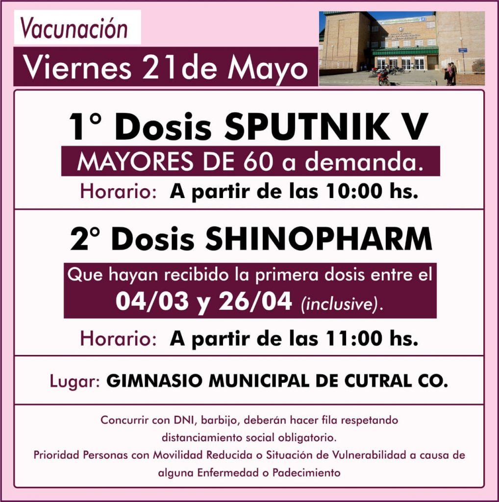 En el gimnasio municipal de Cutral Co será a demanda y la vacunación se pondrá en marcha a las 10 con la primera dosis de Sputnik V para personas mayores de 60 años. En ese mismo espacio, pero desde las 11, se aplicará el segundo componente Sinopharm para personas vacunadas entre el 4 de marzo y el 26 de abril inclusive.