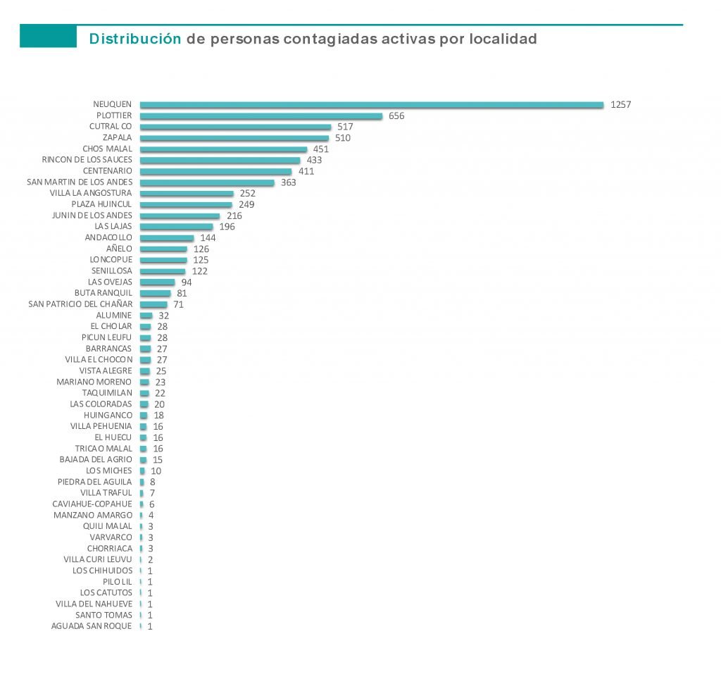 En cuando a las personas recuperadas son 654 en toda la provincia. La ocupación de las camas es del 100,0 % y las personas activas son 6.639.