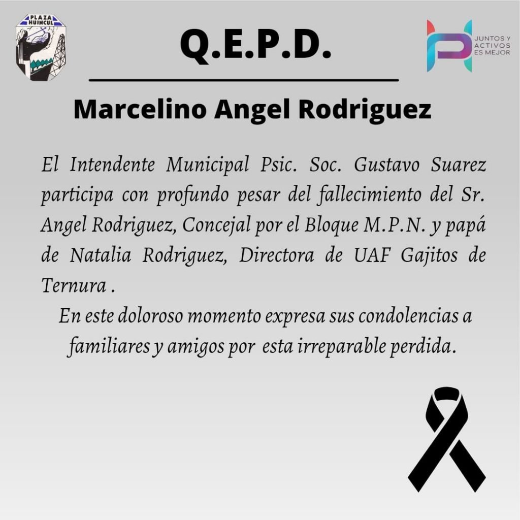 El intendente municipal Psicólogo Social, Gustavo Suárez participa con profundo pesar el fallecimiento del sr Marcelino Ángel Rodríguez, concejal por el bloque del MPN y papá de Natalia Rodríguez, directora de la UAF Gajitos de Ternura.