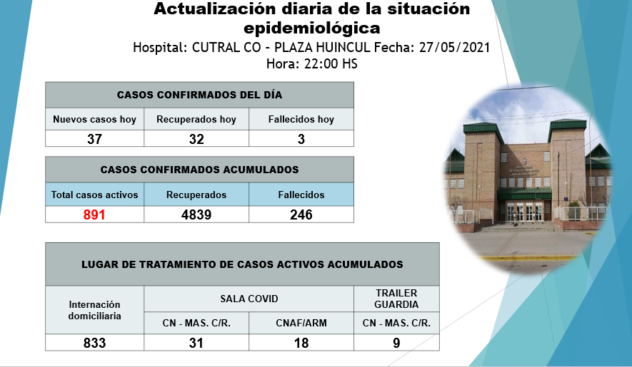 El informe de la situación epidemiológica del hospital de Cutral Co y Plaza Huincul reportó a las 22 del jueves 27 de mayo un total de 3 personas fallecidas en la comarca petrolera por coronavirus.