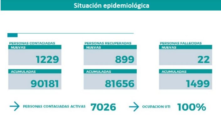 En cuando a las personas recuperadas son 899 en toda la provincia. La ocupación de las camas es del 100,0 % y las personas activas superaron los 7000 casos, son 7026 en total.