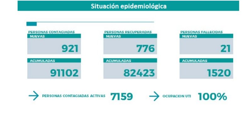 En cuanto a los pacientes recuperados fueron 776 y la ocupación de las camas de UTI sigue siendo del 100 %.