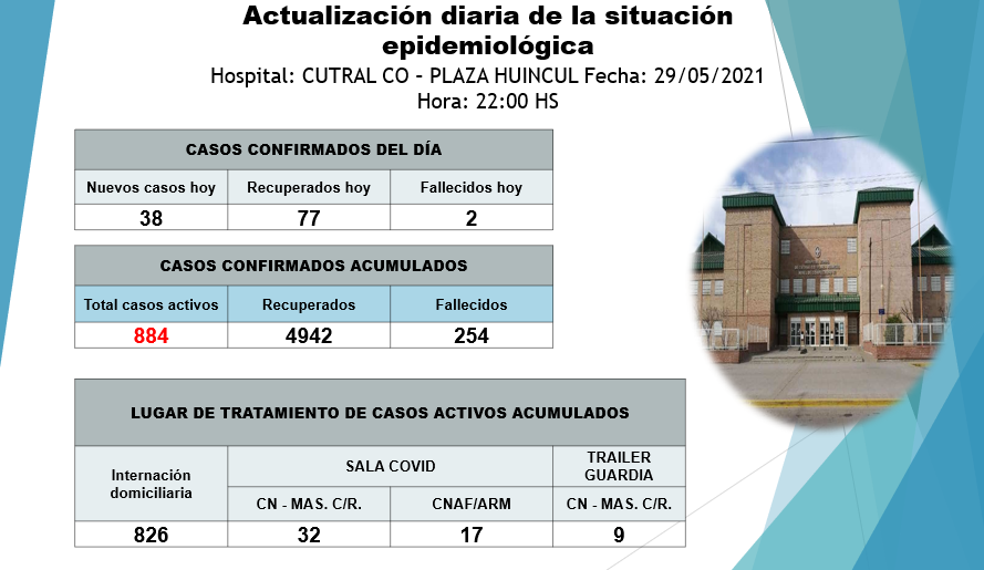 En cuanto a la situación de internación, hay en sala Covid 32 pacientes con oxígeno -en sus diferentes modalidades- y 17 que están con asistencia respiratoria mecánica. Mientras que en la guardia y en los tráilers hay 9 pacientes. En sus domicilios, transitan su enfermedad 826 enfermos.