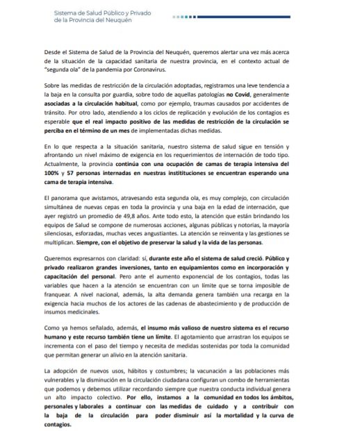 Los integrantes y representantes del sistema de salud tanto público como privado de la provincia de Neuquén, en el contexto de la segunda ola de la pandemia por coronavirus, alertaron una vez más, sobre la situación de la capacidad sanitaria.