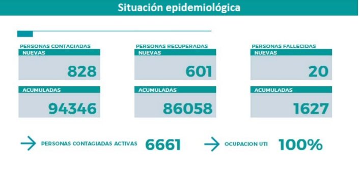 El parte emitido por el comité epidemiológico provincial dio cuenta este miércoles por la noche de 828 personas contagiadas y 20 fallecidas por coronavirus.