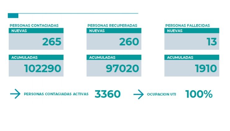 Los recuperados sumaron 260 en toda la provincia. Mientras que la ocupación de las camas UTI sigue siendo del 100 %.