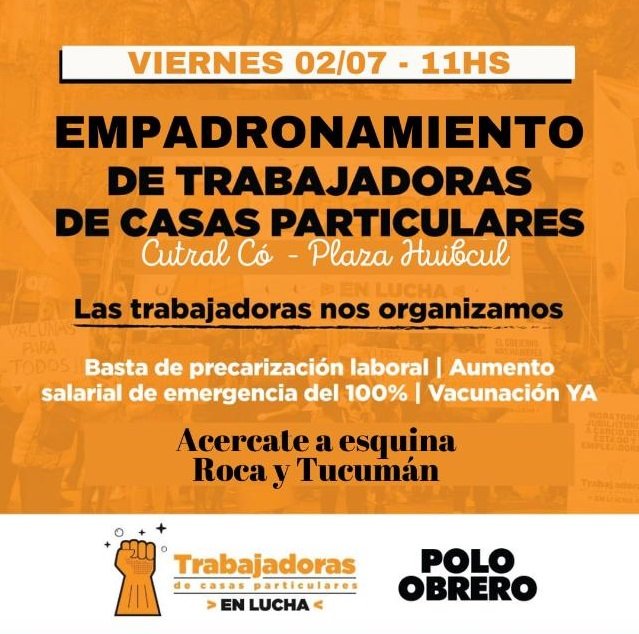 Hoy, desde las 11, en la esquina de Roca y Tucumán estarán integrantes del Polo Obrero para llevar adelante un empadronamiento de trabajadoras de casas particulares tanto de Cutral Co como de Plaza Huincul.