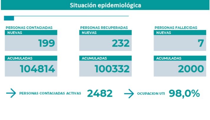 En cuanto a los pacientes recuperados fueron informados 232. Es el tercer día consecutivo que la ocupación de camas UTI se encuentra en el 98 %, según se indicó. Mientras que los casos activos en todo el territorio provincial es de 2.482.