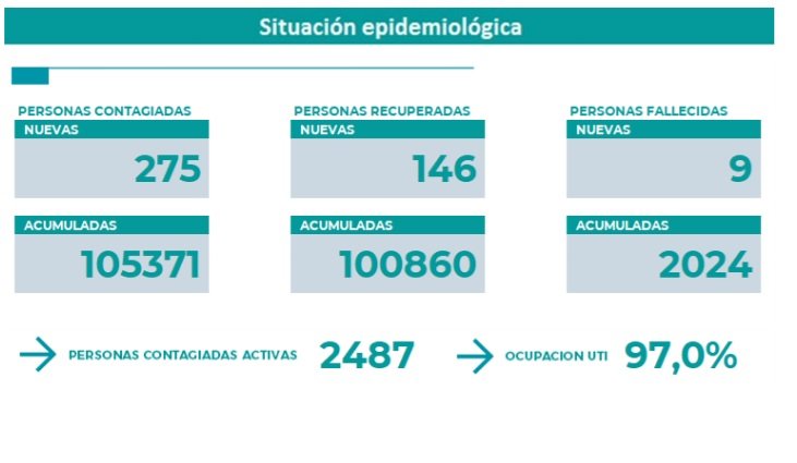 En cuanto a las personas recuperadas son 146 y los contagiados activos son 2.487. En cuanto a la ocupación de camas UTI sigue en el 97% igual que este lunes.