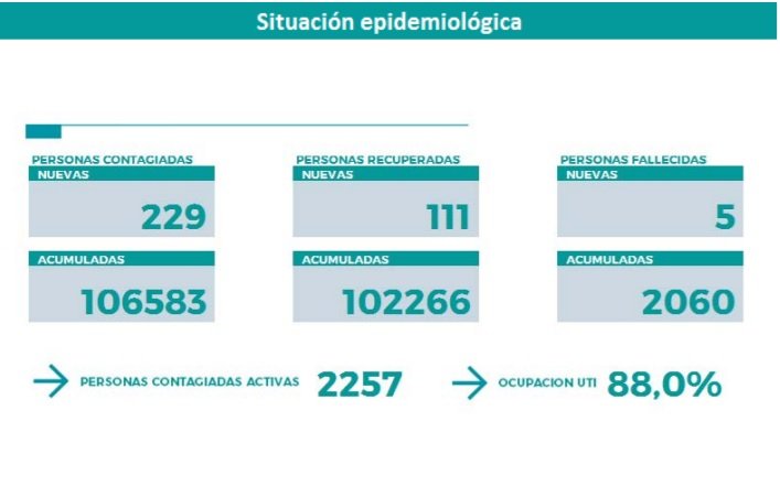 En cuanto a las personas recuperadas son 111. Mientras que la ocupación de camas UTI es del 88 % El total de personas que en toda la provincia transitan la enfermedad es de 2.257.