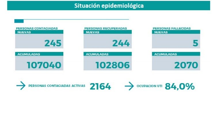 El informe que emitió el comité de emergencia provincial dio cuenta de cinco personas fallecidas y 245 nuevos casos confirmados. Al mismo tiempo se reportaron 244 nuevos pacientes recuperados.