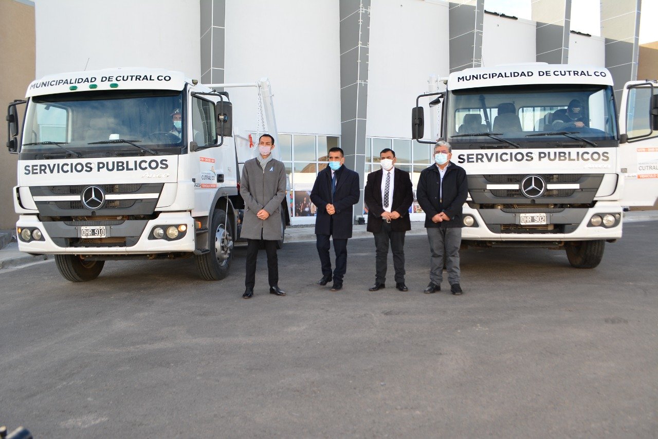 Hoy el municipio cutralquense hizo la entrega de nuevas unidades que se destinará al área de Servicios Públicos. Se trata de dos camiones portavolquetes, con diez volquetes cada uno, y una máquina cortadora de césped profesional.