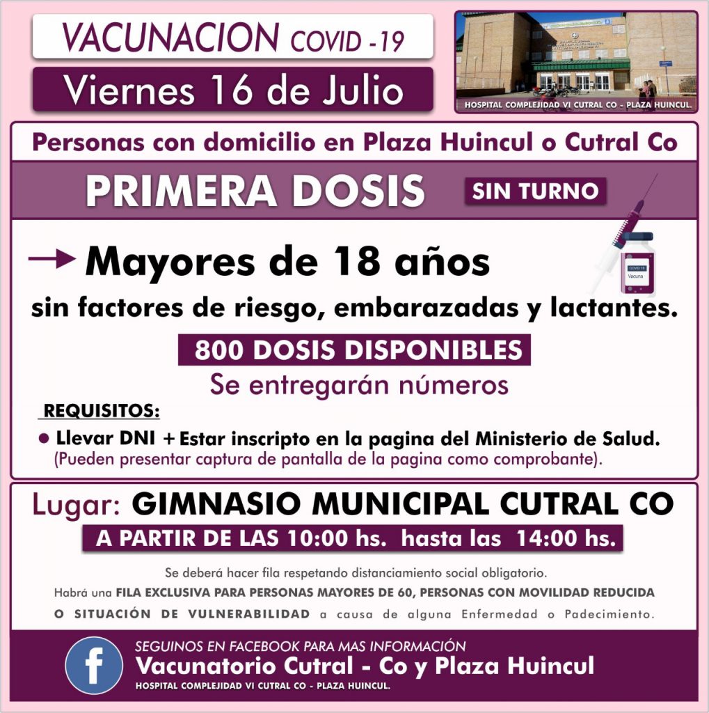 A las 10 hasta las 14 en el gimnasio Municipal de Cutral Co. Se aplican primeras dosis de la vacuna contra el covid-19 para vecinos de ambas ciudades mayores de 18 años.