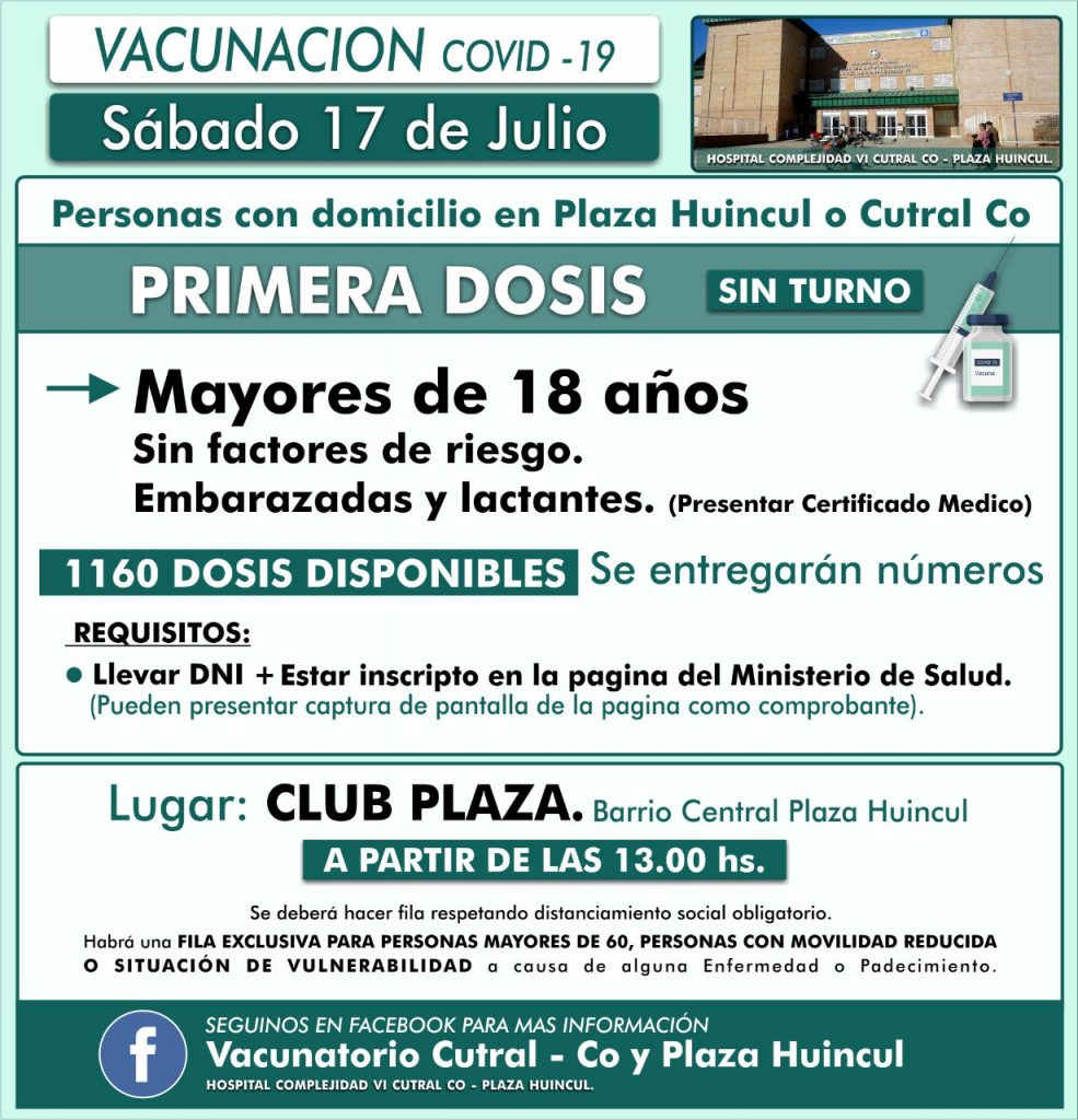 La cantidad de dosis disponibles son 1160 y se entregarán números. Una vez más se pide a las personas que realicen una fila, respetando el distanciamiento social obligatorio dando prioridad a las personas mayores de 60 años, con movilidad reducida o situación de vulnerabilidad.