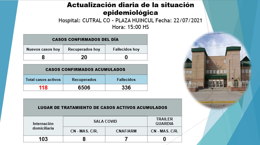 Además fueron 20 casos recuperados en Cutral Co y Plaza Huincul. Del total de los casos, hay 15 personas hospitalizadas y 7 de ellas cuentan con un respirador, mientras que 103 pacientes restantes permanecen con internación domiciliaria.