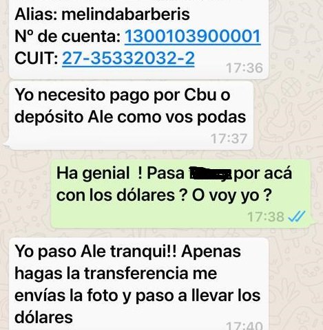 La vecina damnificada con la usurpación de su número de teléfono exhibió las capturas de los mensajes que los estafadores enviaban a sus contactos, con el objetivo de venderles dólares y lograr que les enviaran las transferencias para hacerse del dinero y concretar la maniobra fraudulenta.