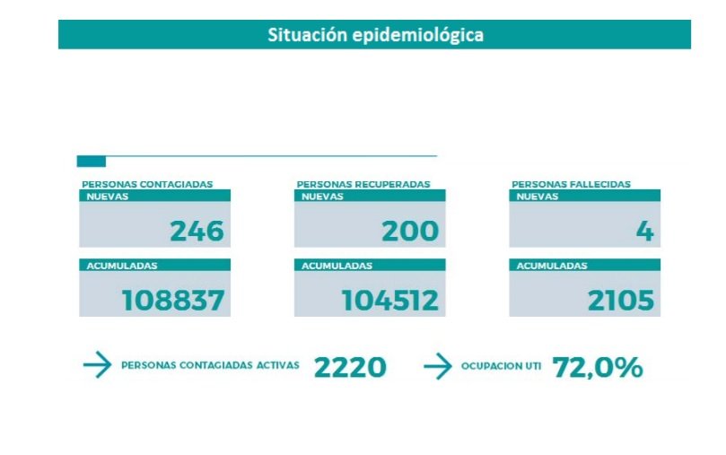 El parte que emite el comité de emergencia provincial en Neuquén, informó que este sábado hubo 4 personas fallecidas y 246 casos confirmados en Neuquén.
