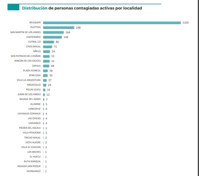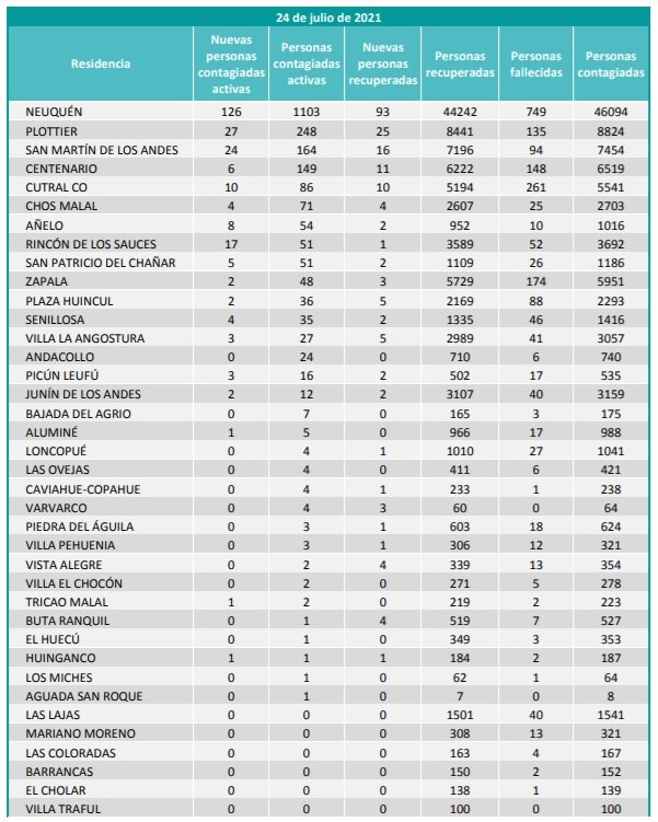 En cuanto a las personas recuperadas, en el territorio neuquino son 200 y los casos activos son 2.220 en total. Por otra parte, se informó que el porcentaje de la ocupación de camas UTI es del 72 %.