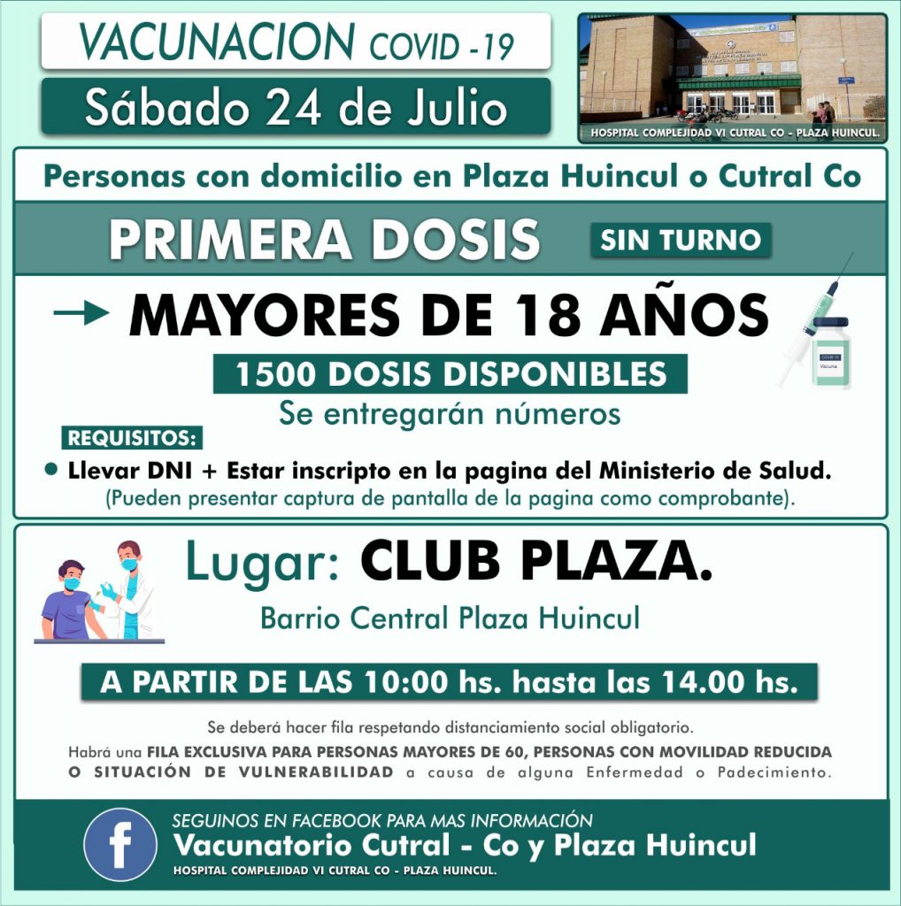 Hoy sábado 24 de julio continuará el operativo de vacunación Covid-19, sin turno para personas de 18 años en adelante solo 1º dosis. Se entregarán números.