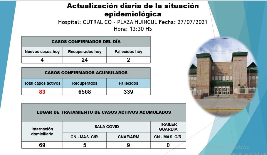 Mientras que en internación domiciliaria hay 69 pacientes. En total, los casos activos en Cutral Co y Plaza Huincul descendieron a 83. La nómina de fallecidas asciende a 339 en las dos ciudades