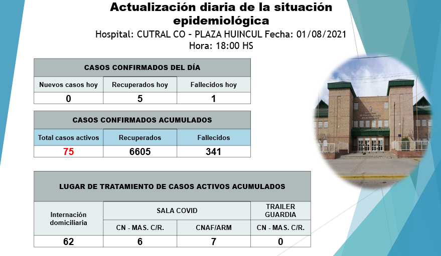 Se dieron a conocer los datos de la situación epidemiológica de Cutral Co y Plaza Huincul, desde el hospital zonal. Se informó que no hubo casos nuevos y quedan solamente 75 casos activos.